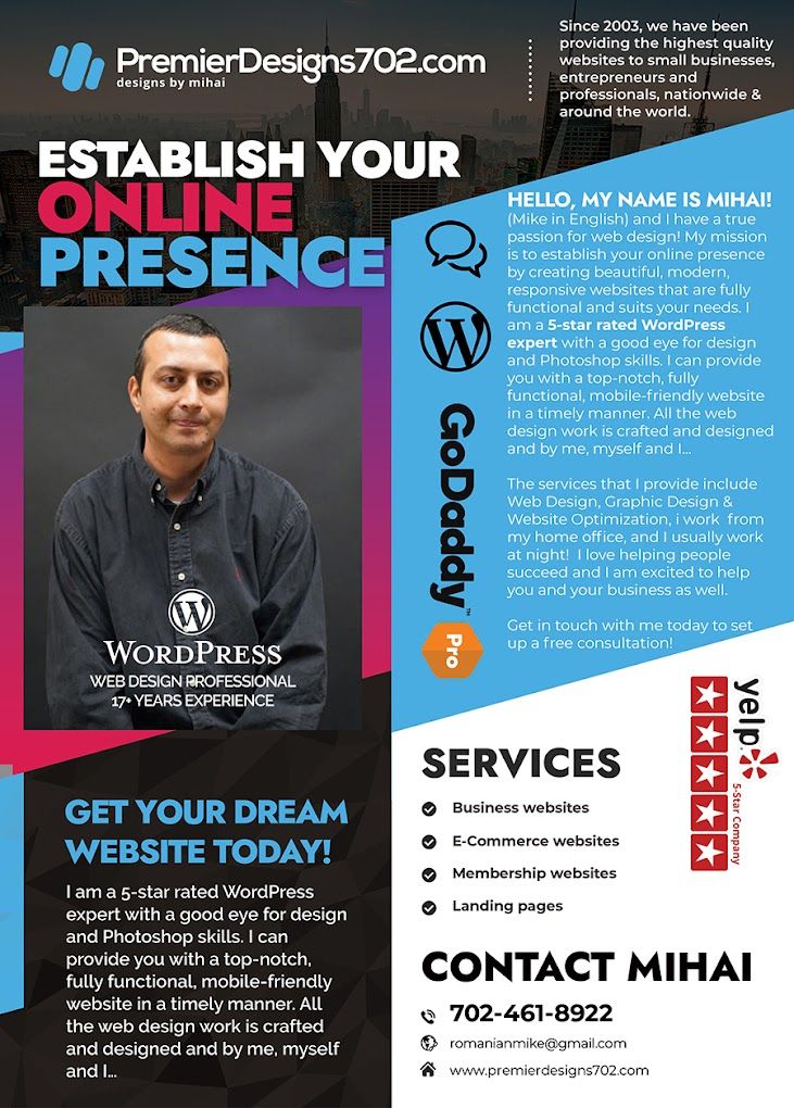 Welcome to Premier Designs 702! I’m Mihai, dedicated to helping businesses flourish online through exceptional web design. With my 21 years of experiend in Las Vegas WordPress websites and reliable maintenance, my goal is to help your b business establish your online presence and create solutions that elevate your brand.